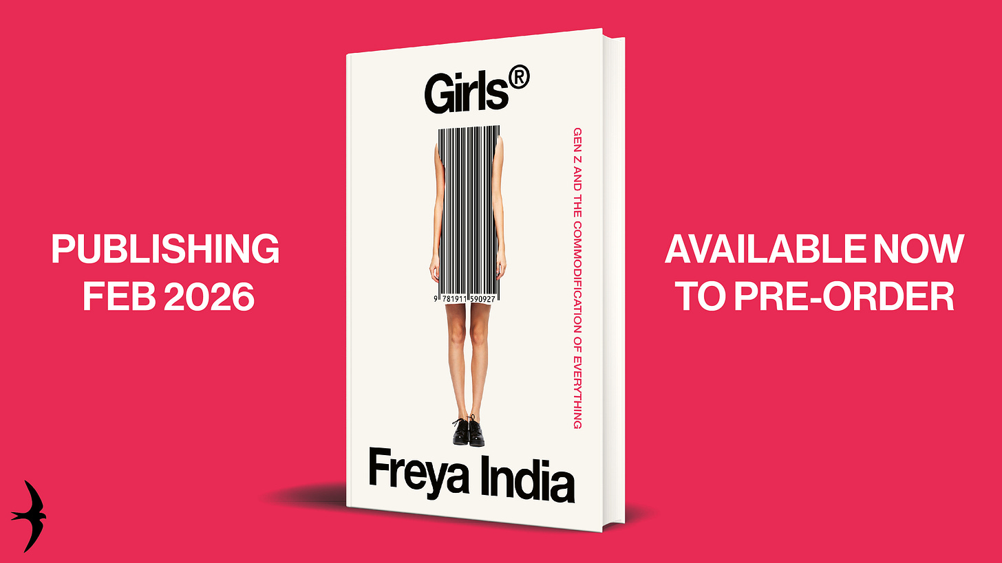 Thank you to all of you for making this possible. I first had the idea for Girls® back in 2021, when I was scrawling notes on receipts at the café where I worked, writing on my hand between coffees, then rushing home to pour it all into essays, desperate to figure out why I felt so anxious and alone. I decided to test chapter ideas by starting this Substack, and along the way found so many of you who felt the same. So it means more than you know to finally share this here. This crisis, and how to put girls back together again, is very close to my heart. I hope I have done it justice.