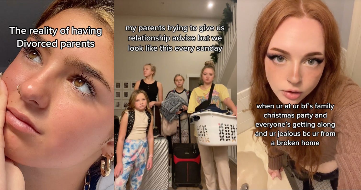 What’s also weird and ironic to me is that a progressive culture so well-versed in therapy-speak has this much trouble talking about family breakdown. Ours is a culture obsessed with trauma! We think we can get PTSD from university speakers and stupid jokes and election results. And yet it’s also a culture which largely ignores and even glamorises what seems to me one of the most obvious traumas of all?? If anything qualifies as traumatic—as in, an emotionally distressing event that leaves a lasting impact—surely it’s family breakdown, which really does seem to stay with people, shape their view of love and life and just keep playing out, over and over?