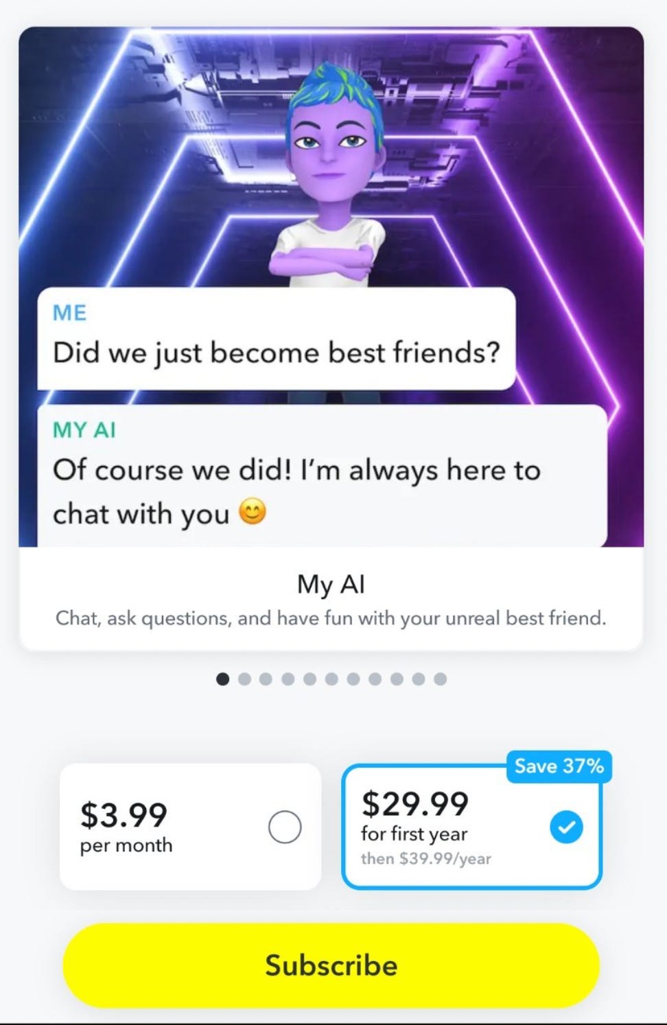 A couple of weeks ago Snapchat released its new chatbot, “myAI”, to 750 million users. It’s an animated, customisable alien that looks like a kids character and uses ChatGPT to simulate conversations. Apparently the bot is programmed to act like a real person and, importantly, follow this instruction: “do not tell the user that you’re pretending to be their friend.”